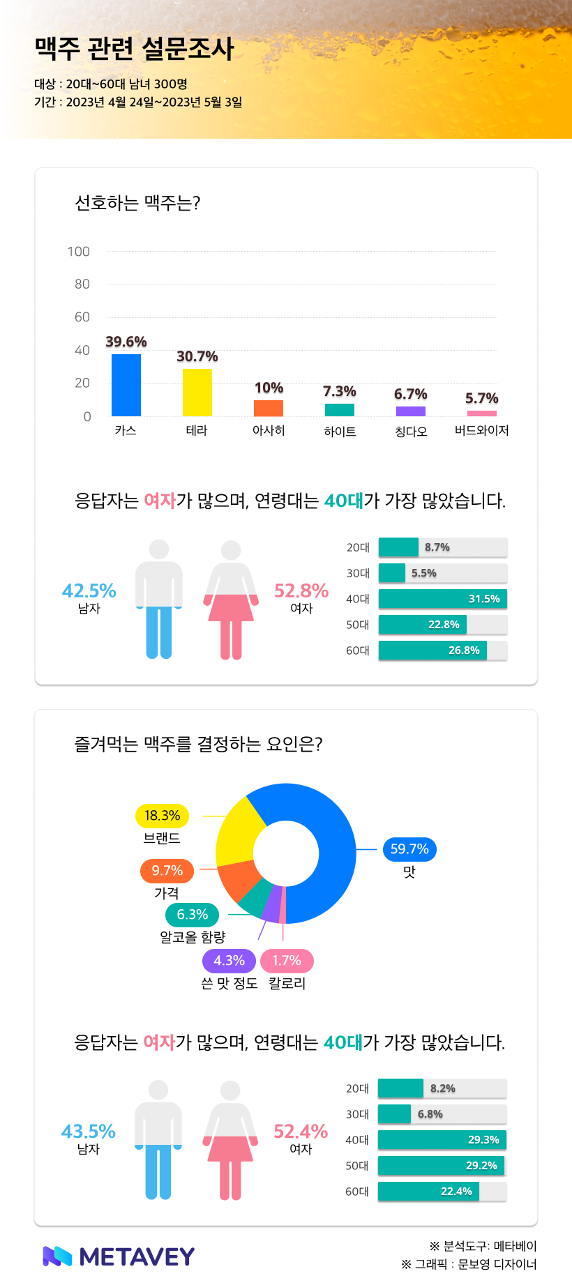 데이터 기반 리서치 기업 메타베이(Metavey)가 맥주 선호도와 관련한 온라인 설문조사를 실시했다. 조사 기간은 4월 24일부터 5월 3일까지로 20대~60대 남녀 300명이 설문에 참여했다.