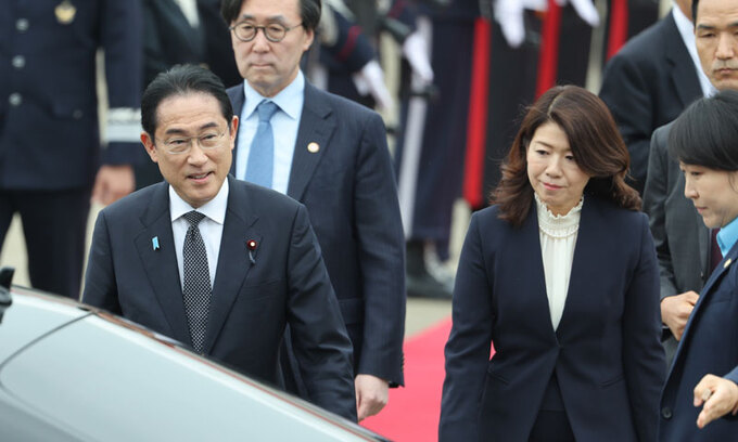 한일 정상회담을 위해 방한한 기시다 후미오 일본 총리와 기시다 유코 여사가 7일 성남 서울공항에 도착, 차량 탑승을 위해 이동하고 있다. 연합뉴스
