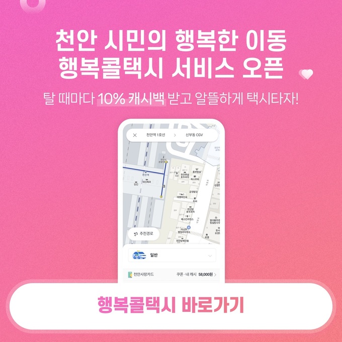 박상돈 천안시장은 “호출비와 중개수수료 등 별도 이용 수수료가 없고 캐시백을 제공하는 천안사랑카드 앱 택시호출 서비스를 통해 시민과 택시 업계가 모두 상생하는 교통 서비스가 정착되길 기대한다”고 말했다.