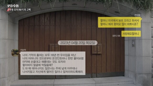 지난 9일 방송된 MBC 시사·교양 프로그램 ‘PD수첩-전두환의 숨겨진 재산, 전우원 모자의 고백’에 출연한 우원씨는 할머니인 이 여사가 머물고 있는 서울 연희동 저택을 찾았지만, 이 여사는 그의 전화도 받지 않았다.