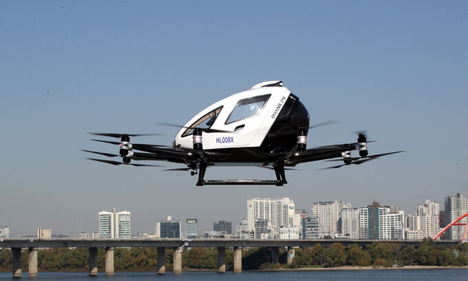 2020년 11월 서울시와 국토교통부 주최로 열린 도심항공교통(UAM) 서울실증 비행 행사에서 드론택시가 시범비행을 하고 있다. 뉴스1