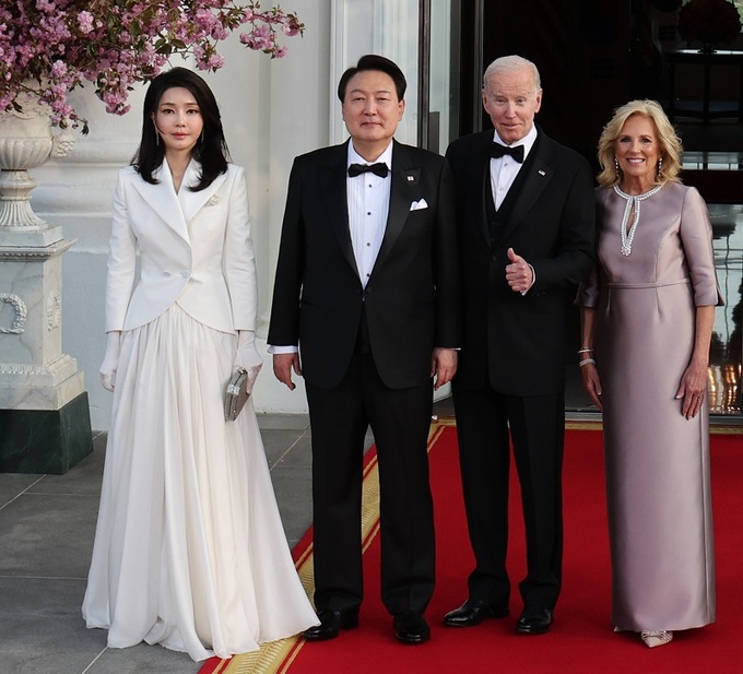아울러 “질 바이든의 신념은 브랜드 이름이 자주 화제가 되어서는 안 된다는 것(Biden's belief is that a brand name should rarely be a talking point)”이라면서 “옅은 보라색이 그녀를 돋보이게 할 수 있지만 그녀는 손님들의 의상, 특히 ‘clotheshorse’로 잘 알려졌으며 폭넓은 시폰 스커트와 작은 하얀 장갑을 착용한 김 여사가 패션 감각을 드러내도록 하는 데(provide the fashion credentials) 더 행복을 느낀다”고 전했다.