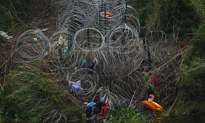 미국이 이민자 신속 추방을 위해 시행한 ‘타이틀 42’ 종료 다음 날인 지난 12일(현지시간) 멕시코 동북부 마타모로스에서 텍사스주로 들어가기 위해 건너야만 하는 리오그란데강 철조망 사이에 걸린 옷가지와 튜브가 보인다. 밤사이 강을 건넌 이민자들이 미처 들고 가지 못한 것으로 추정된다. 앞쪽에 새 부리 모양이 있는 어린이용 튜브도 눈에 띄는데, 국경 순찰대를 피해 어둠을 뚫고 숨죽여 강을 건너야만 했던 어린 이민자의 모습이 그려진다. 타이틀 42 종료 기대감에 국경으로 몰려든 이민자들은 하루 한 끼 겨우 먹는 열악한 환경에서도 ‘약속의 땅’을 향한 여정을 포기하지 않고 있다.