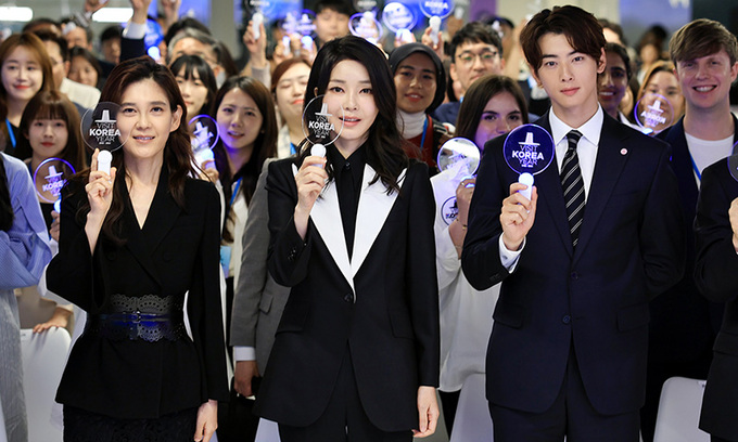 윤석열 대통령 부인 김건희 여사(가운데)가 23일 서울 중구 한국관광공사에서 열린 K관광 협력단 출범식에서 기념사진을 찍고 있다. 왼쪽부터 한국방문의 해 위원장인 이부진 신라호텔 사장, 김 여사, 한국방문의 해 홍보대사인 배우 차은우. K관광 협력단은 교통, 숙박, 쇼핑 등 관광 관련 80여개 기업·협회가 참여하는 민관협력기구로 관광현장을 지원하고 관광 서비스 개선을 위해 활동하는 단체다.