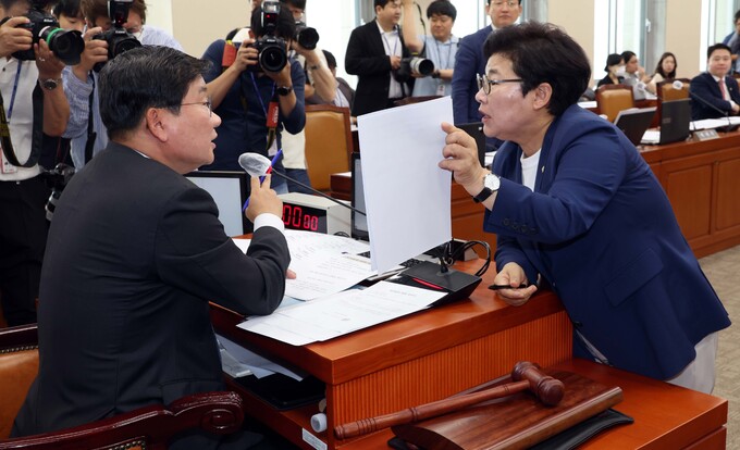 24일 오전 국회에서 열린 환경노동위원회 전체회의에서 여당 간사인 국민의힘 임이자 의원이 ''노란봉투법'' 본회의 직회부 요구안 상정에 대해 전해철 위원장과 야당 간사인 더불어민주당 김영진 의원에게 항의하고 있다./2023.05.24 서상배 선임기자