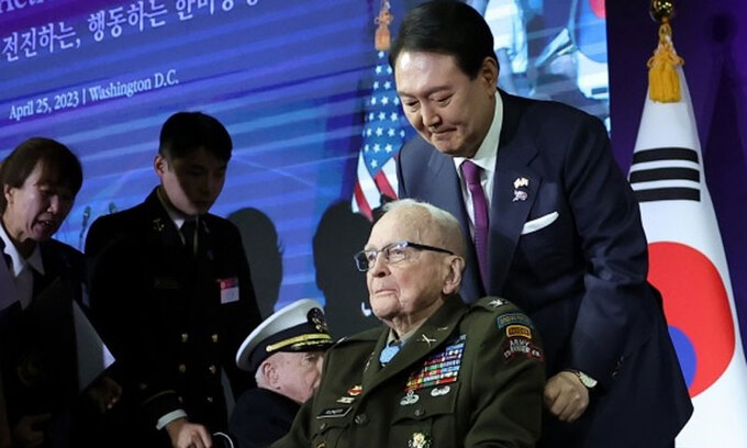최근 미국을 국빈으로 방문한 윤 대통령은 4월 25일 수도 워싱턴의 한 호텔에서 6·25전쟁 참전용사 본인과 후손 등을 초청한 가운데 한·미동맹 70주년 기념 오찬을 열었다. 명예훈장 수훈자이자 6·25전쟁 10대 영웅의 한 명인 퍼킷도 당연히 자리를 함께했다. 윤 대통령은 고령으로 거동이 힘든 퍼킷의 휠체어를 직접 밀어 행사장 중앙 무대로 이동하는 등 극진한 예우를 갖췄다. 퍼킷 등 생존해 있는 미국인 참전용사 3명에게 우리의 태극무공훈장도 수여했다. 윤 대통령은 “참전용사들의 희생이 없었다면 오늘날 대한민국도 없을 것”이라며 퍼킷을 비롯한 참전용사들한테 여러 차례 허리 숙여 인사했다.