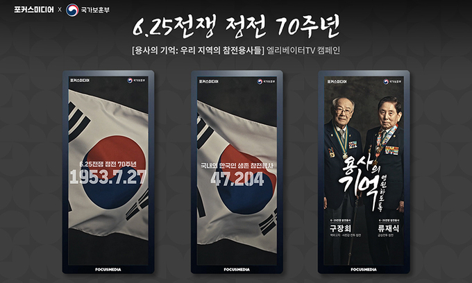 엘리베이터TV 기업 포커스미디어는 국가보훈부와 6·25전쟁 정전 70주년을 기념해 참전용사의 헌신과 희생에 감사하는 ‘용사의 기억: 우리 지역의 참전용사들’ 캠페인을 다음달 2일까지 진행한다고 5일 밝혔다.