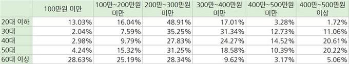 연령별로 살펴보면, 20대 직장인의 월급 비중은 200만~300만원 미만이 48.90%, 300만~400만원 미만이 17.01%, 400만~500만원 미만이 3.28%, 500만원 이상이 1.72%였습니다.