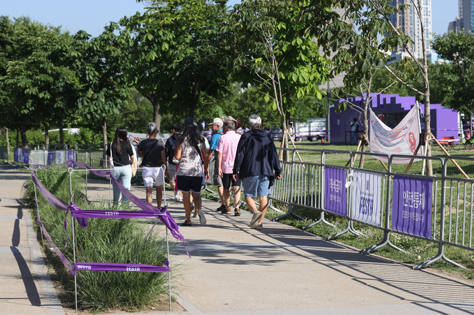 17일 낮 최고 기온이 30도를 넘은 가운데 오후 ‘방탄소년단(BTS) 10주년 페스타’ 행사가 열리는 서울 여의도한강공원 일대에는 아침부터 팬들이 모여들었다. 행사장으로 향하는 5호선 지하철도 각국 팬으로 가득찼으며, 저녁시간에 예정된 불꽃놀이까지 약 30만명이 몰릴 것으로 전망된다.