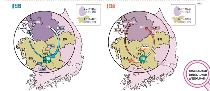 대전에서 빠져나간 인구는 20만10701명)이었는데, 충남(1만3880명·17.7%)으로 가장 많이 빠져나갔다. 그 뒤로 경기(1만3694명·17.5%), 서울(1만3169명·16.8%), 세종(1만642명·13.6%) 등이었다.