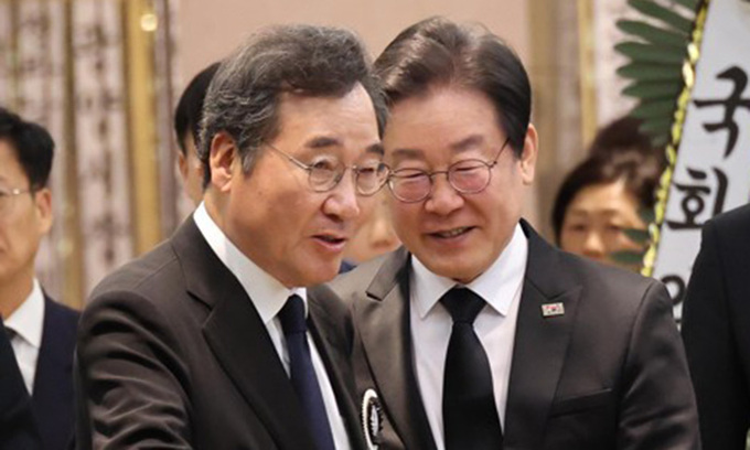 더불어민주당 이낙연 전 대표(왼쪽)가 지난 4월 9일 오후 장인상 빈소가 마련된 서울 강남구 삼성서울병원 장례식장에서 조문을 마친 더불어민주당 이재명 대표를 배웅하고 있다. 공동취재