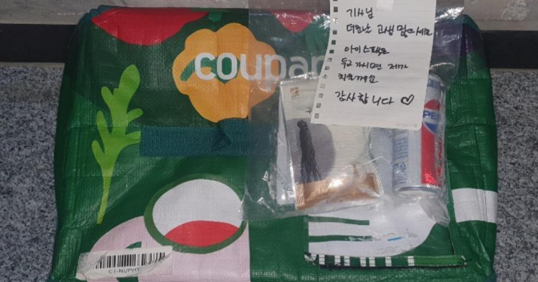 함께 게시한 사진에서는 “기사님 더운 날 고생 많으세요. 아이스팩은 두고 가시면 제가 치울게요. 감사합니다♥”라고 적힌 종이가 쿠팡 회수용 박스 위에 놓여 있다.