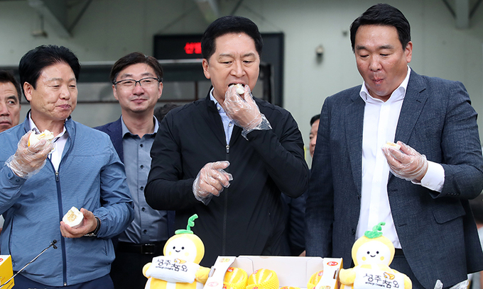 ‘사드 괴담’ 비판 성주참외 시식 입력 : 2023-06-26 23:00:09 수정 : 2023-06-26 23:00:09 구글 네이버 유튜브 국민의힘 김기현 대표(가운데)가 26일 사드(THAAD·고고도미사일방어체계)가 있는 경북 성주의 농산물공판장을 찾아 참외를 맛보며 사드 전자파의 안전성을 강조하고 있다. 왼쪽은 이병환 성주군수, 오른쪽은 국민의힘 정희용 의원. <뉴스1>뉴스1> Copyright ⓒ 세계일보. 무단 전재 및 재배포 금지 뉴스1