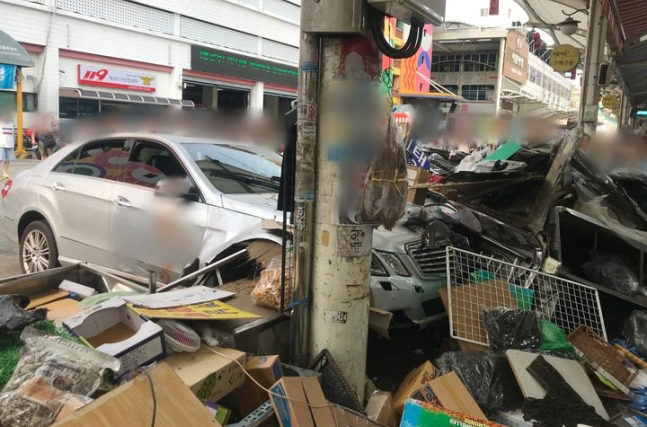 소방안전본부 등에 따르면 28일 오후 4시23분 시장에서 A(70·여)씨가 운전하는 벤츠 차량이 주차장 출입구 앞 노점을 덮쳤다.