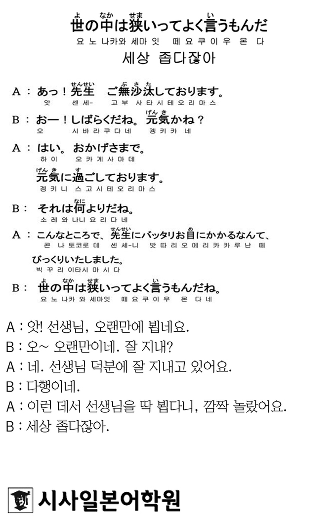 [시사일본어학원의 초단기 일본어 회화] 세상 좁다잖아 입력 : 2023-07-03 18:09:22 수정 : 2023-07-03 18:09:21 구글 네이버 유튜브 Copyright ⓒ 세계일보. 무단 전재 및 재배포 금지 세계일보