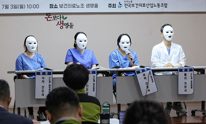 이날 증언대회에는 전·현직 간호사·물리치료사들이 안면 마스크를 착용한 채 나와 보건의료 인력 부족으로 현장에서 발생하는 다양한 문제들을 진술했다.