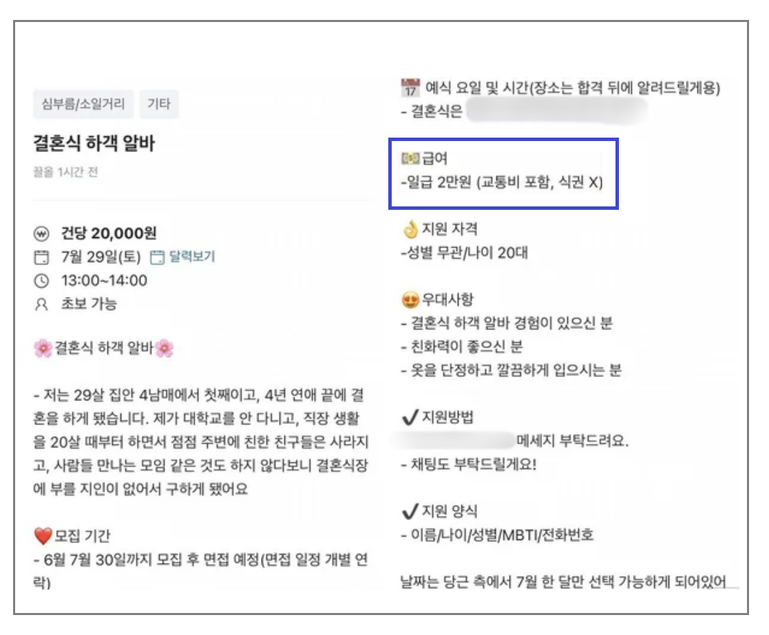 ‘일급 2만원(교통비 포함·식권X)’ 결혼식 하객 구인 글에…누리꾼 “너무 적어” vs “사정 들으니 이해가”