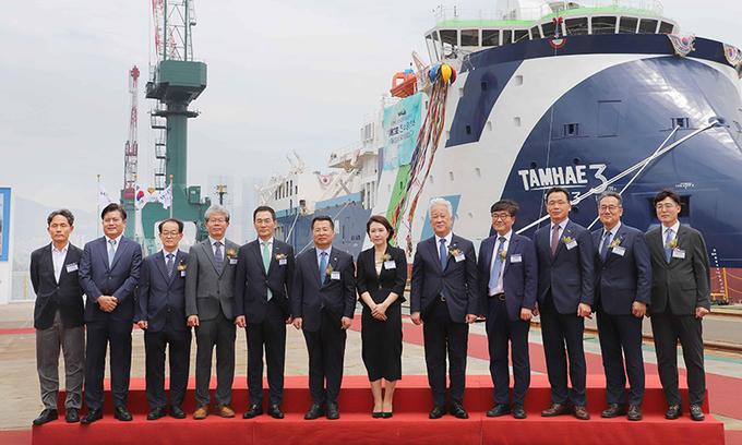 한국지질자원연구원과 산업통상자원부, HJ중공업은 6일 부산 HJ중공업에서 탐해3호 진수·명명식을 진행했다.