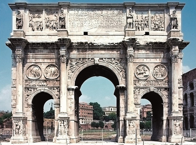 아치는 다리와 수로의 교각들의 연결에 이용됐고, 황제의 즉위나 전쟁의 승리를 기념하는 개선문에도 사용됐다. 세 개의 아치를 연결한 ‘콘스탄티누스 황제 개선문’은 콘스탄티누스가 정적인 막센티우스를 제거하고 황제에 즉위한 것을 기념하기 위해서 만들었다. 넓은 영토 관리를 위해 콘스탄티누스 황제가 도시 비잔티움을 자신의 이름을 딴 콘스탄티노플(지금 튀르키예 이스탄불)이란 지명의 새 수도로 세우기 몇 년 전에 제작한 것이다.