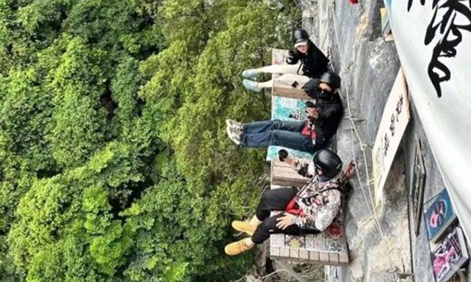 중국의 사회관계망서비스(SNS)를 통해 공유된 사진을 보면 카페 손님들은 안전벨트, 헬멧, 등산화를 착용한 상태로 로프에 연결된 채 커피를 마시고 있었다.