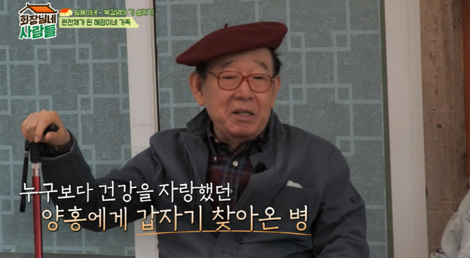 파킨슨병은 뇌의 신경전달물질 중 하나인 도파민이 부족해 나타나는 퇴행성 뇌질환이다. 김수미는 "치료는 할 수 있느냐"며 "그래도 얼굴은 참 좋다"고 하자, 심양홍은 "먹고 노니까 그렇다"며 웃었다.