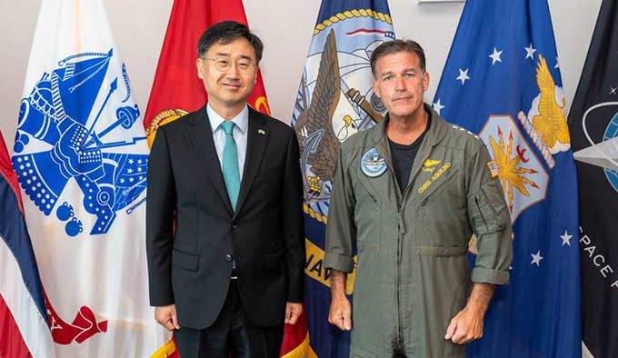 국방부는 24일 신범철 국방부차관은 국군전사자 유해봉환을 위해 하와이를 방문한 자리에서 미국 인도태평양사령관을 접견했다며 이같이 밝혔다. 신 차관과 아퀼리노 사령관은 한반도와 역내 안보상황을 평가하고 주요 동맹현안에 대해 논의했다.