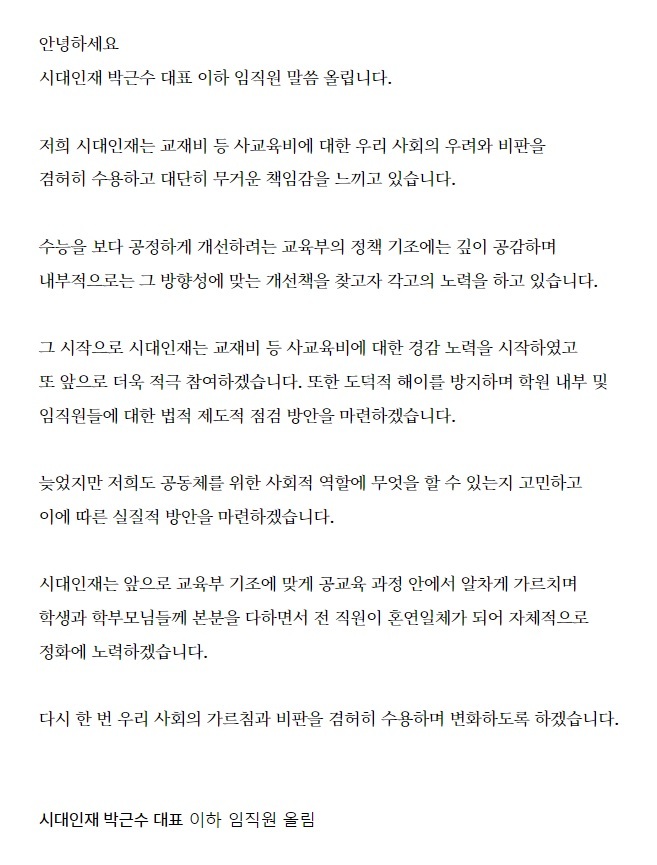 아울러 “그 시작으로 시대인재는 교재비 등 사교육비 경감 노력을 시작했고 앞으로 더욱 적극 참여하겠다”며 “도덕적 해이를 방지해 학원 내부와 임직원들에 대한 법적, 제도적 점검 방안을 마련하겠다”고 약속했다.