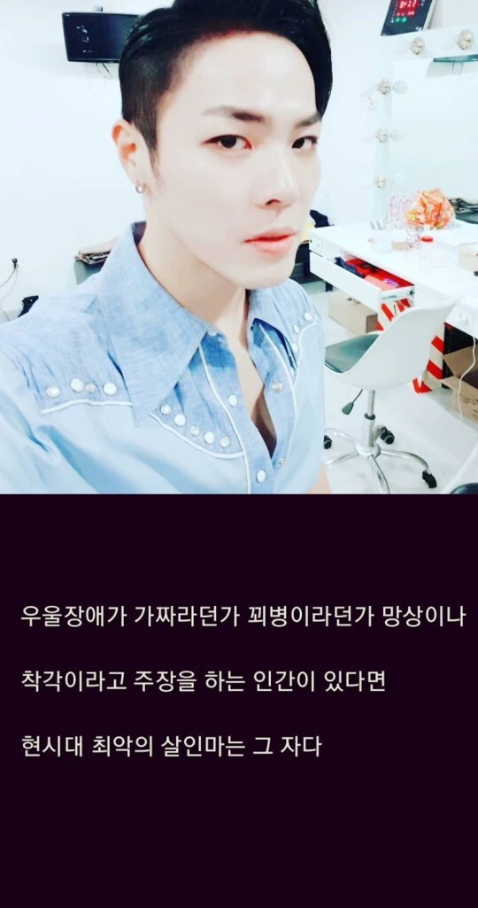 휘성은 27일 자신의 인스타그램을 통해 "우울장애가 가짜라던가 꾀병이라던가 망상이나 착각이라고 주장을 하는 인간이 있다면 현시대 최악의 살인마는 그자다"라는 글을 게재했다.