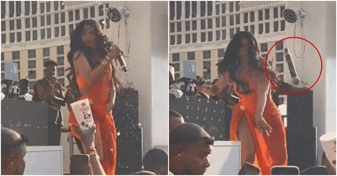 미국 래퍼 카디 비가 공연 중 술을 뿌린 관객에게 마이크를 던졌다.
