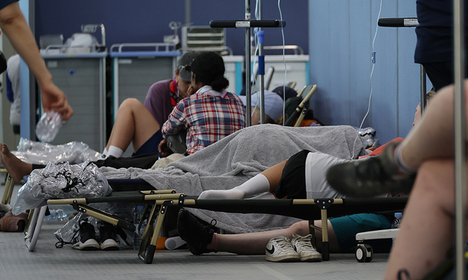 이런 침상마저도 차지하지 못한 환자들은 의자에 앉아 눈을 감고 있거나, 열을 식히려고 차가운 물병을 얼굴에 대고 있었다.