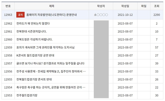 7일 전라북도 등에 따르면 전날부터 이날까지 전북도청 공식 홈페이지에 전주월드컵경기장에서의 K-팝 콘서트 행사 진행 관련 당국을 비판하는 누리꾼들의 글 약 100개가 올라와 있다.