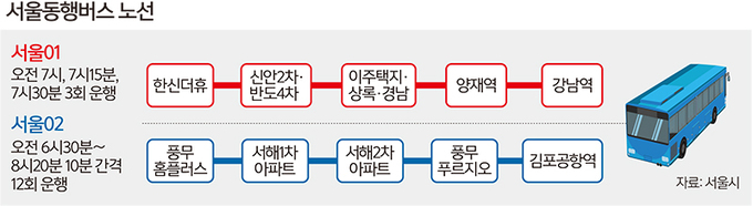 서울01번, 서울02번 버스 요금은 각각 광역버스와 간선버스 요금이 적용돼 3000원, 1500원이다. 환승할인도 일반 버스와 동일하게 받을 수 있다. 서울01번은 내년 GTX-A노선 개통 시까지, 서울02번은 내년 김포골드라인 증차 시까지 한시적으로 운행된다.