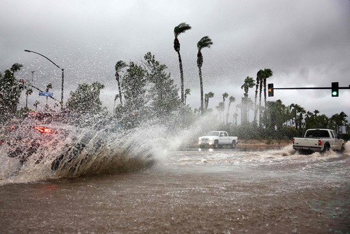 차량들이 20일(현지시간) 허리케인 ‘힐러리’가 상륙하며 뿌린 비로 물에 잠긴 미국 캘리포니아주 커시드럴시티의 도로를 지나가고 있다. 국립허리케인센터에 따르면 캘리포니아주에 열대성 폭풍이 상륙한 것은 1997년 ‘노라’ 이후 26년 만으로, 당시 폭풍은 큰 피해가 없었지만 힐러리는 1939년 큰 피해를 낸 열대성 폭풍 이후 84년 만에 가장 강력한 폭풍우로 관측돼 캘리포니아 지역을 긴장시키고 있다.