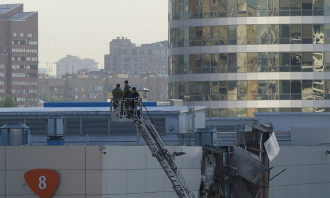 18일(현지시간) 러시아 모스크바에서 우크라이나 드론이 격추된 뒤 수사관들이 손상된 건물 지붕 인근에서 조사 작업을 펼치고 있다. 로이터연합뉴스