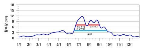 기상청은 지난해 장마백서를 통해 우기 개념을 도입했다. 장마백서에 따르면 6월 하순부터 9월 하순에 기후 평균 강수량보다 4㎜ 넘게 비가 내리는 시기가 '우기'로 정의된다.
