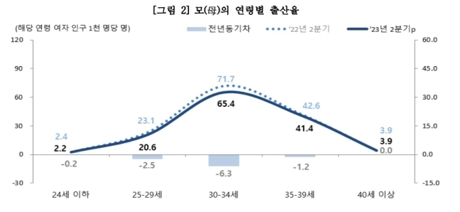 2분기 모(母)의 연령별 출산율(해당 연령 여성 인구 1000명당 출생아 수)을 보면 30~34세가 65.4명으로 가장 높았다. 이어 △35~39세(41.4명) △25~29세(20.6명) △40세 이상(3.9명) △24세 이하(2.2명) 등 순이었다.