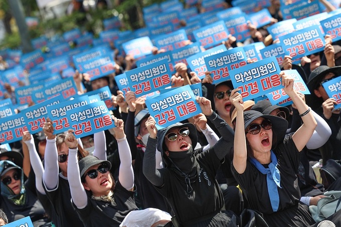 지난 2일 서울 영등포구 국회대로에서 열린 ‘50만 교원 총궐기 추모 집회’에 참석한 교사들이 구호를 외치고 있다. 연합뉴스