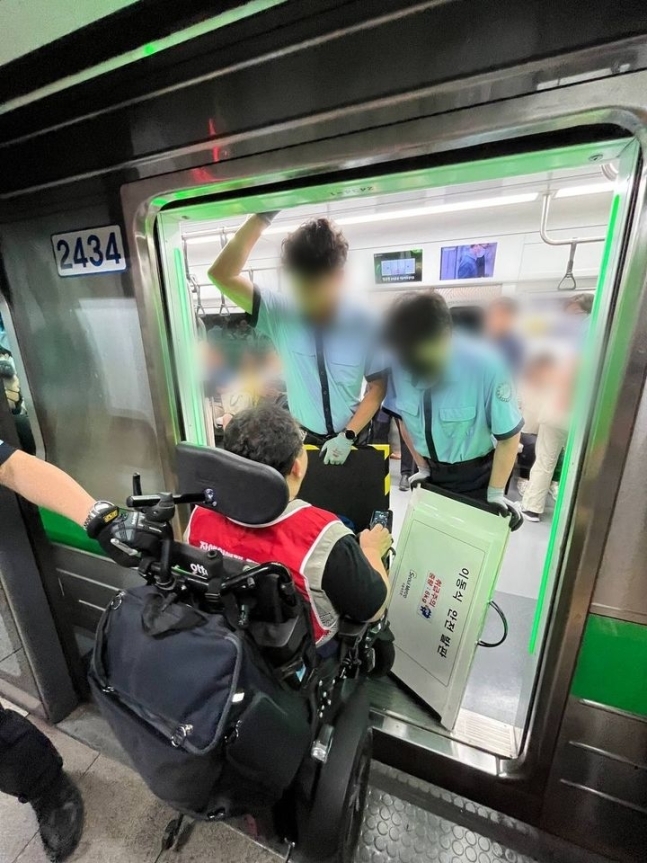 이 과정에서 휠체어를 탄 전장연 활동가의 탑승에 시간이 걸리거나, 서교공 직원이 탑승을 제지하는 등 실랑이가 벌어졌다. 활동가들은 “지하철 탑승 왜 막냐”, “장애인 이동권 보장해달라” 등을 외쳤다.