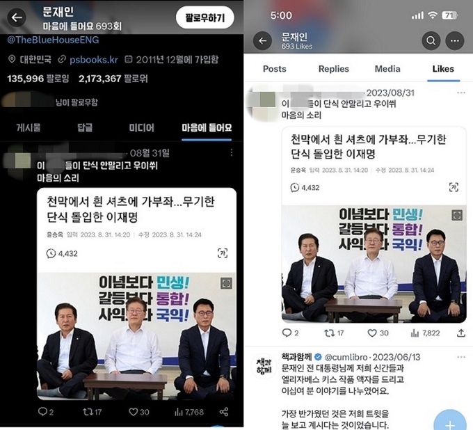 윤석열 정부의 민주주의 파괴에 맞서겠다며 ‘무기한 단식 투쟁’에 돌입한 이재명 더불어민주당 대표를 조롱하는 듯한 ‘엑스(X·옛 트위터)’ 게시글에 문재인 전 대통령 계정이 ‘좋아요’를 눌렀었다는 주장이 온라인 커뮤니티에서 최근 제기됐다.