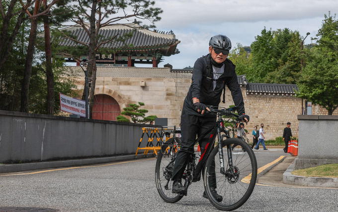 유인촌 문화체육관광부 장관 후보자가 14일 서울 모처에 마련된 인사청문회 준비 사무실을 자전거를 탄 채 들어서고 있다. 윤석열 대통령은 지난 13일 국방부 장관 후보에 국민의힘 신원식 의원, 문화체육관광부 장관 후보에 유인촌 대통령실 문화체육특보, 여성부 장관 후보에 김행 전 국민의힘 비상대책위원을 지명했다.