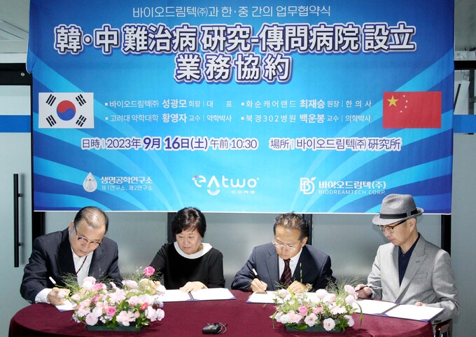 16일 충북 청주 오창에 위치한 바이오드림텍 연구소에서 ‘난치병 전문병원 설립을 위한 한·중간 업무협약식’을 가졌다.