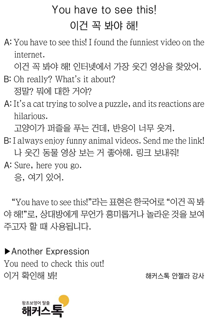 [해커스톡 일대일 영어회화] 하루 1분 기초 영어회화 말하기 (9월 18일) 입력 : 2023-09-18 09:00:00 수정 : 2023-09-17 18:07:03 구글 네이버 유튜브 You have to see this! 이건 꼭 봐야 해! Copyright ⓒ 세계일보. 무단 전재 및 재배포 금지 세계일보