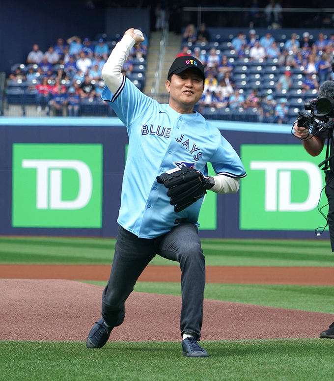 오세훈 서울시장이 16일(현지시간) 캐나다 토론토 로저스센터에서 펼쳐진 미국 프로야구 메이저리그 토론토 블루제이스와 보스턴 레드삭스 경기 시구자로 나섰다. 오 시장은 이날 등번호 ‘OH 5’가 새겨진 토론토 블루제이스의 하늘색 유니폼을 입고 구장에 등장했다. 토론토 블루제이스 소속 류현진 선수가 포수로 나서 오 시장의 시구를 받았다.