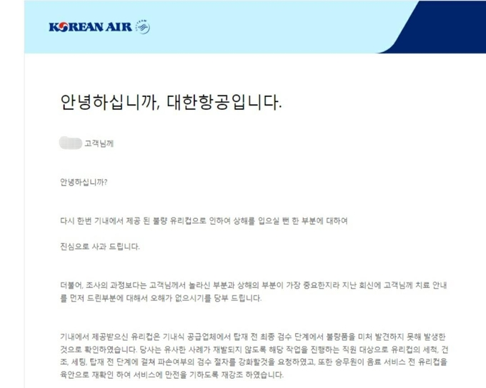 항공사 관계자는 "승객에게 사과와 함께 필요시 치료비와 전자 우대할인권 제공 등 보상에 대해 안내해드렸다. 유사사례 재발 방지를 위해 기내식 공급업체에 경위 조사를 진행하고 기내식 기물 파손 여부에 대한 검수 절차를 강화하겠다. 객실 기내 음료 서비스 전에는 맨눈으로 추가 검수 후 서비스를 제공하도록 했다"고 설명했다.