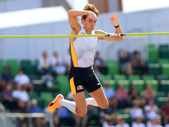 ‘스파이더맨’ 아먼드 듀플랜티스(스웨덴)가 18일 미국 오리건주 유진 헤이워드 필드에서 열린 2023 세계육상연맹 다이아몬드리그 파이널 남자 장대높이뛰기에서 6m23을 넘고 있다. 이는 듀플랜티스가 종전에 보유한 실내외 통합 세계기록인 6m22를 1㎝ 경신한 세계신기록이다. 실외 세계 1∼4위, 실내 세계 1∼5위 기록을 모두 보유하고 있는 듀플랜티스는 다이아몬드리그 파이널 3연패도 달성했다.
