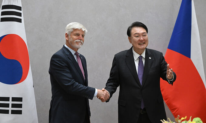 이날 회담에서 윤 대통령은 파벨 대통령에게 “한국과 체코는 1990년 수교 이래 자유, 인권, 법치와 같은 보편적 가치를 공유하며 긴밀히 협력해왔다”면서 “한반도, 우크라이나 등 국제문제에 있어서도 협력을 확대해 나가기를 기대한다”고 말했다. 파벨 대통령은 “한국의 2024∼2025년 유엔 안전보장이사회(안보리) 비상임이사국 활동을 적극 지지한다”며 “북한의 핵·미사일 위협에 공동 대응하겠다”고 약속했다. 이어 “한국과 일본의 관계를 개선한 윤 대통령의 리더십을 평가한다”고 덧붙였다.