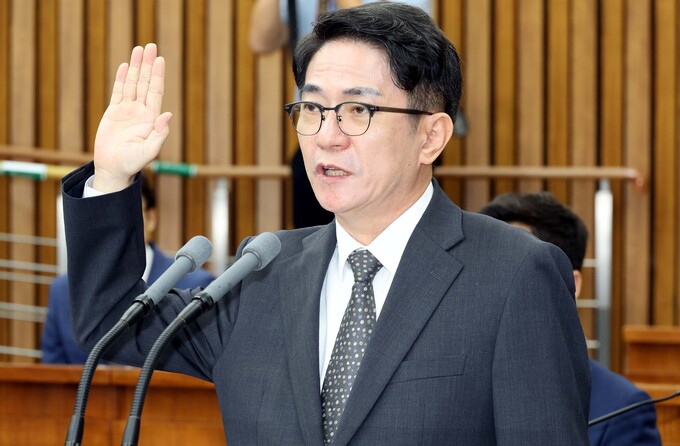 19일 국회에서 열린 대법원장 후보자 인사 청문회에서 이균용 후보자가 증인선서를 하고 있다.