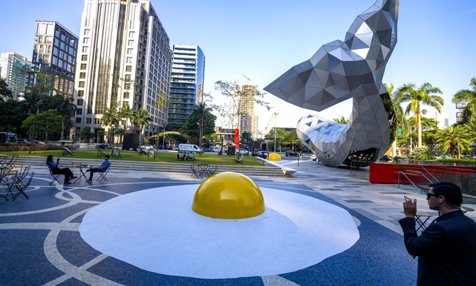 네덜란드 작가 헨크 호프스트라의 거대 계란프라이 조형물 ‘아트 에그시던트(계란과 사고의 합성어)’가 20일(현지시간) 브라질 상파울루 도심의 한 광장에 전시됐다. 갑자기 나타났다 며칠 내로 사라지는 이 작품에 대해 작가는 지구온난화에 대한 관심을 촉구하기 위해 세계 곳곳에서 게릴라식 전시를 하고 있다고 밝힌 바 있다.
