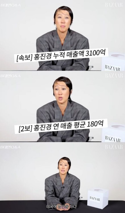 이에 홍진경은 "둘 다 틀렸다. 너무 극단적이다. 솔직하게 매출을 이야기할까요? 한 번쯤 바로 잡고 싶었다. 부풀려지는 것도 싫지만 너무 줄여 (기사) 쓰는 것도 안 좋더라. 매출은 제가 번 돈이 아니다. 매출이 이익이라고 생각하시는 분은 없으실 거다. 이익은 정말 쥐꼬리만 하다. 거기다 세금 떼고 차 떼고 포 떼고 나면…"이라면서 말을 흐렸다.