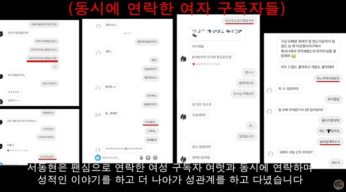 박씨가 글과 함께 공개한 영상에서는 서씨와 그의 통화 녹취본이 담겨있었다. 영상에서 박씨는 “서씨는 채팅 어플 속 모르는 여성 앞에서 카메라를 키고 음란 행위를 하며 팬심으로 연락한 여성 구독자 여럿과 동시에 성관계를 가졌다”고 주장했다.
